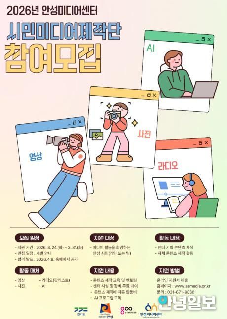 안녕일보 배윤 기자 | 안성시 미디어센터는 시민과 지역 모임(단체)의 미디어 콘텐츠 제작 활동을 지원하는 ‘시민미디어제작단’ 사업 참여자를 오는 3월 31일까지 모집한다.