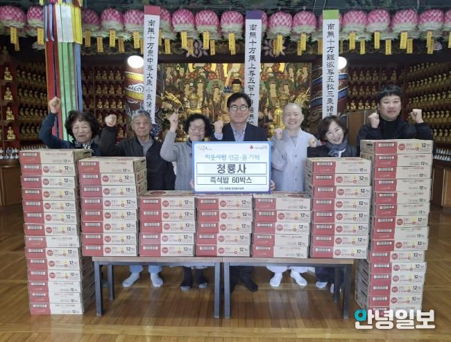 안녕일보 배윤 기자 | 가평 청룡사는 최근 지역의 소외된 이웃들에게 도움이 되길 바라는 마음으로 청평면 행정복지센터에 즉석밥 60박스를 기탁했다.