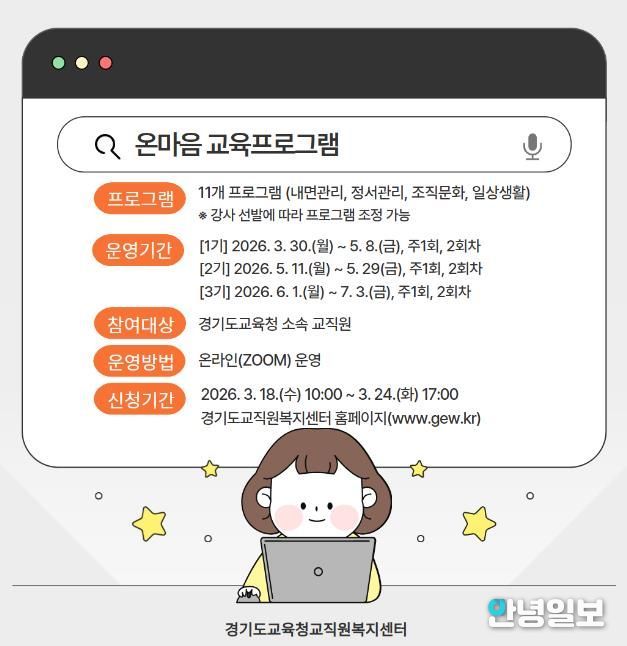 안녕일보 배윤 기자 | 경기도교육청교직원복지센터가 교직원의 정서 회복과 자기 돌봄 역량 강화를 위해 녪년 상반기 온마음 교육 프로그램’를 운영한다.