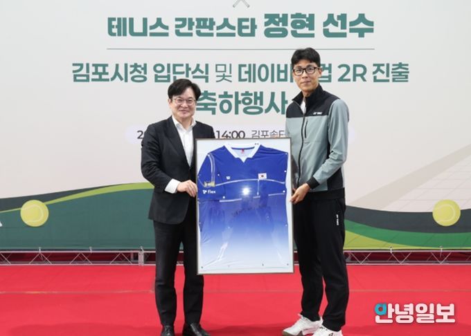 안녕일보 배윤 기자 | 김포시는 17일 솔터실내테니스장에서 대한민국 테니스 스타 정현 선수의 김포시청 직장운동경기부 테니스팀 입단을 기념하고, 데이비스컵 2라운드 진출을 축하하는 행사를 개최했다.