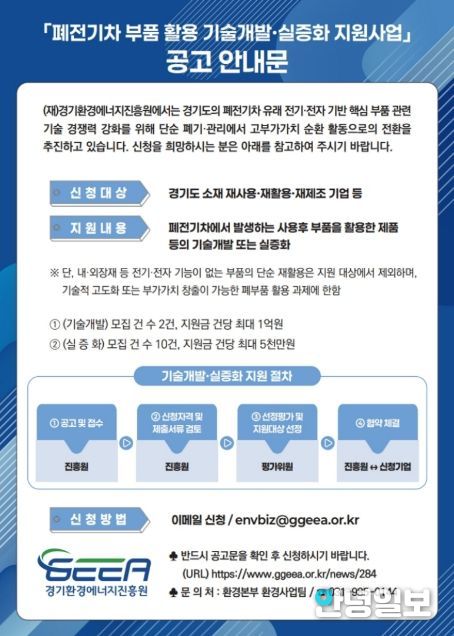 안녕일보 배윤 기자 | 경기환경에너지진흥원은 4월 7일까지 ‘2026년 폐전기차 부품 활용 기술개발 및 실증화 지원사업’에 참여할 기업을 모집한다.