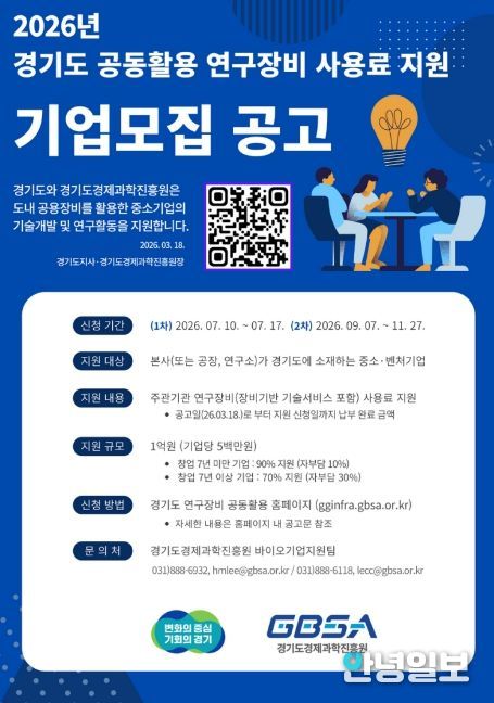 안녕일보 배윤 기자 | 경기도와 경기도경제과학진흥원이 도내 중소·벤처기업의 연구개발(R&D) 경쟁력 강화를 위해 ‘2026년 경기도 공동활용 연구장비 사용료 지원 사업’을 추진한다.