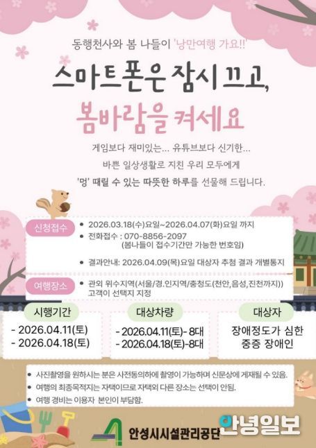 신청기간은 3월 18일부터 4월 7일까지이며, 운영일자는 4월 11일과 4월 18일이다. 지원규모는 회차별 8대 차량으로 총 16대이며, 신청방법은 전화 접수로 선착순 마감된다. 여행 목적지는 신청자가 희망하는 지역으로 서울·경기·인천·충청권 등에서 자율적으로 선택할 수 있다.