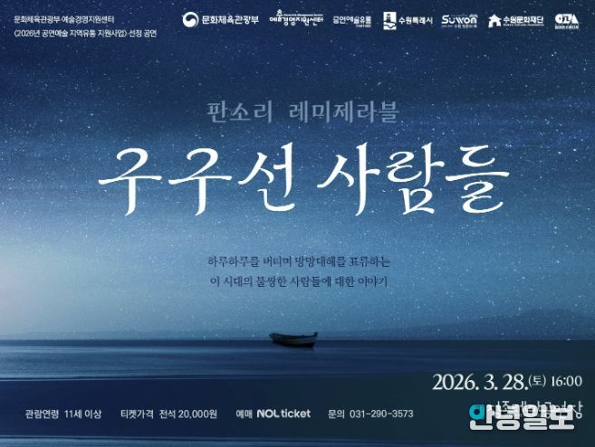 수원문화재단은 정조테마공연장에서 오는 28일 오후 4시, 문화체육관광부와 예술경영지원센터의 ‘2026 공연예술 지역유통 지원사업’ 선정작인 ‘판소리 레미제라블 '구구선 사람들'’을 선보인다.