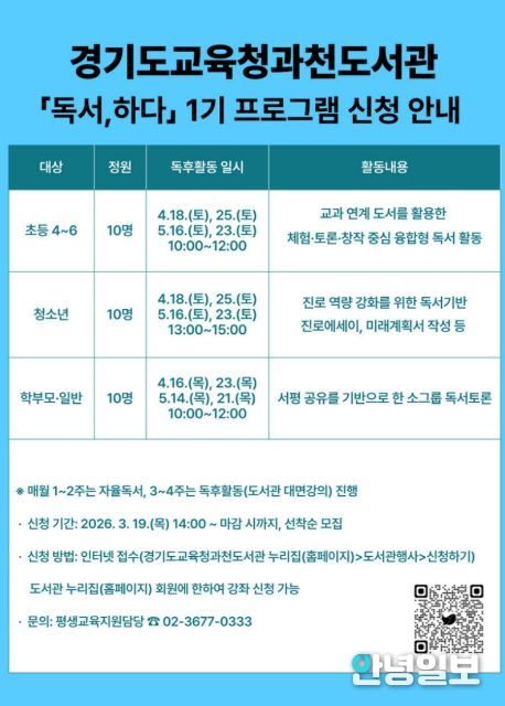 안녕일보 배윤 기자 | 경기도교육청과천도서관이 지역주민의 독서 역량 강화와 융합적 사고력 함양을 위해 '2026년 독서, 하다’프로그램을 운영한다.