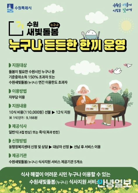 수원시 관계자는 “누구나 든든한 한끼는 기존 지원 기준을 넘어선 시민들도 돌봄서비스를 이어갈 수 있도록 보완한 사업”이라며 “시민의 건강한 식생활과 건강 증진에 도움이 되길 바란다”고 말했다.