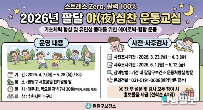 안녕일보 배윤 기자 | 수원시 팔달구보건소가 시민들의 건강 생활 실천을 돕고 비만율을 낮추는 프로그램 ‘2026년 팔달 야(夜)심찬 운동교실’을 운영한다.