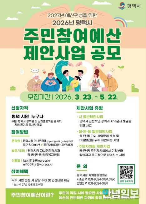 안녕일보 배윤 기자 | 평택시가 3월 23일부터 5월 22일까지 2027년도 예산 편성을 위한 2026년도 주민참여예산 제안사업 공모를 시행한다.