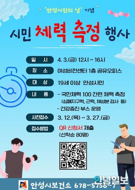 이번 행사는 오는 4월 3일 오후 12시부터 4시까지 안성시 여성비전센터 1층 공유오피스에서 진행된다. 현장에서는 체력 측정뿐만 아니라 심뇌혈관 질환 예방, 신체활동, 금연, 구강 관리 등 건강 인식 향상을 위한 다양한 건강증진 부스도 함께 운영될 예정이다.