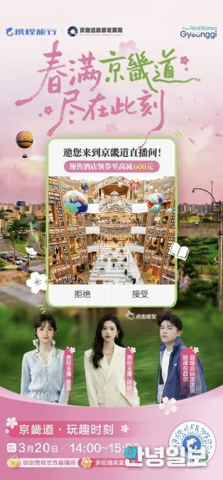 경기관광공사는 20, 21일 이틀간 스타필드 수원 별마당도서관에서 중국 최대 여행플랫폼인 씨트립(트립닷컴 그룹 운영플랫폼)과 중국 여행소비자 대상, 경기관광 홍보 및 상품 할인 판매를 위한 온라인 라이브 커머스를 진행한다.