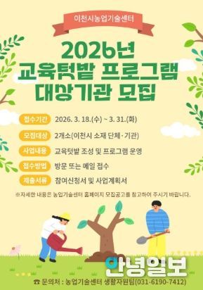 안녕일보 배윤 기자 | 이천시는 도시농업 기반 조성 및 활성화를 위해 2026년 도시농업 교육텃밭 프로그램 대상자를 3월 31일까지 모집한다고 밝혔다.