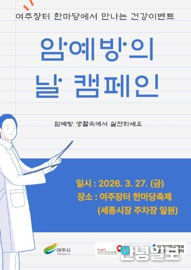 안녕일보 배윤 기자 | 여주시 건강증진과는 오는 3월 27일, 세종시장 주차장 일원 ‘여주장터 한마당 축제’ 현장에서 시민과 함께하는 암예방의 날 기념 캠페인을 운영한다.