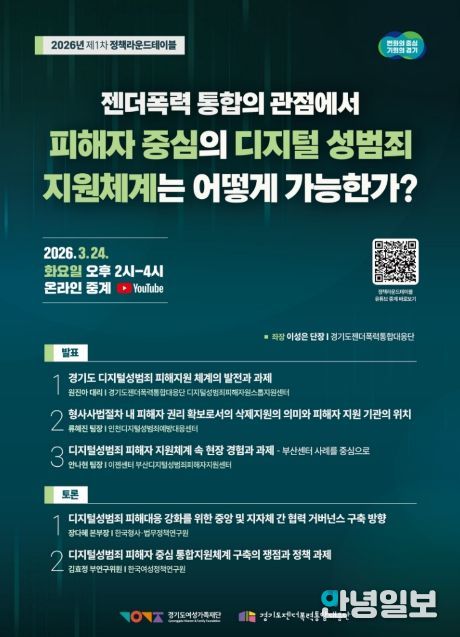 안녕일보 배윤 기자 | 경기도와 경기도젠더폭력통합대응단은 24일 오후 2시 ‘젠더폭력 통합의 관점에서 피해자 중심의 디지털 성범죄 지원체계는 어떻게 가능한가?’라는 주제로 2026년 제1차 정책라운드테이블을 개최한다.