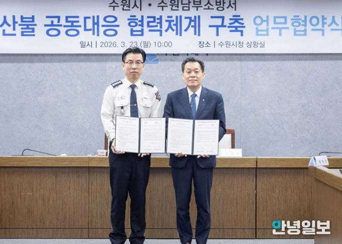 수원시와 수원남부소방서는 23일 시청 상황실에서 ‘산불 신속 대응을 위한 업무협약’을 체결하고, 협력을 약속했다.