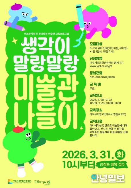 안녕일보 배윤 기자 | 여주세종문화관광재단은 유아를 대상으로 하는 미술관 교육프로그램 '생각이 말랑말랑, 미술관 나들이'를 오는 4월부터 10월까지 아트뮤지엄 려에서 운영한다고 밝혔다.