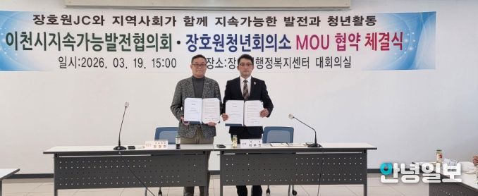 안녕일보 배윤 기자 | 이천시지속가능발전협의회는 지난 3월 19일, 장호원읍행정복지센터 대회의실에서 장호원청년회의소와 지역사회 청년활동의 리더십 과제 협업을 위한 업무협약(MOU)을 체결했다고 밝혔다.