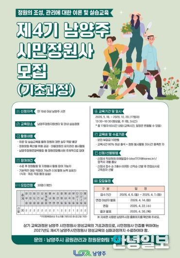 안녕일보 배윤 기자 | 남양주시는 ‘제4기 남양주시민정원사 양성교육(기초과정)’ 참여자를 모집한다고 24일 밝혔다.