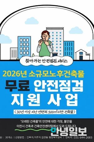 안녕일보 배윤 기자 | 이천시는 건축물 노후화로 인한 안전사고를 예방하고 시민 안전을 강화하기 위해 ‘2026년 찾아가는 소규모 노후건축물 안전점검 지원사업’을 추진한다고 밝혔다.