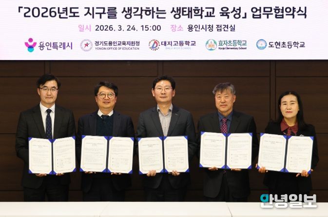 안녕일보 배윤 기자 | 용인특례시는 24일 시청 접견실에서 용인교육지원청을 비롯해 3개 학교와 ‘지구를 생각하는 생태학교 육성사업’을 위한 협약을 맺었다.