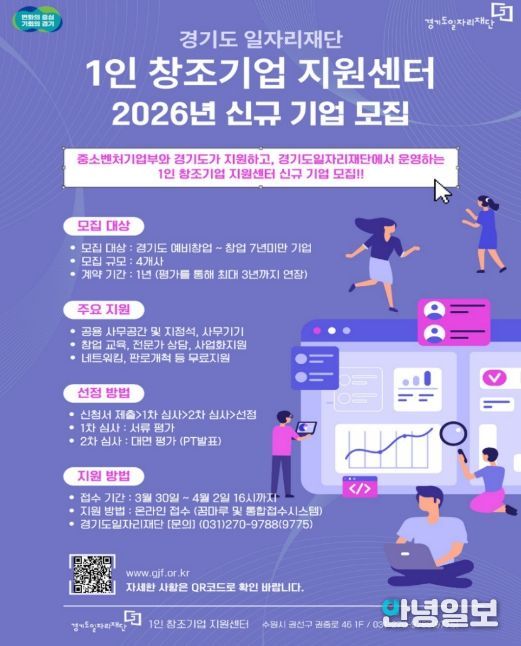 안녕일보 배윤 기자 | 경기도일자리재단은 창업자와 예비 창업자에게 사무공간과 사업화를 지원하는 ‘1인 창조기업 지원센터’ 참여기업을 30일부터 모집한다.