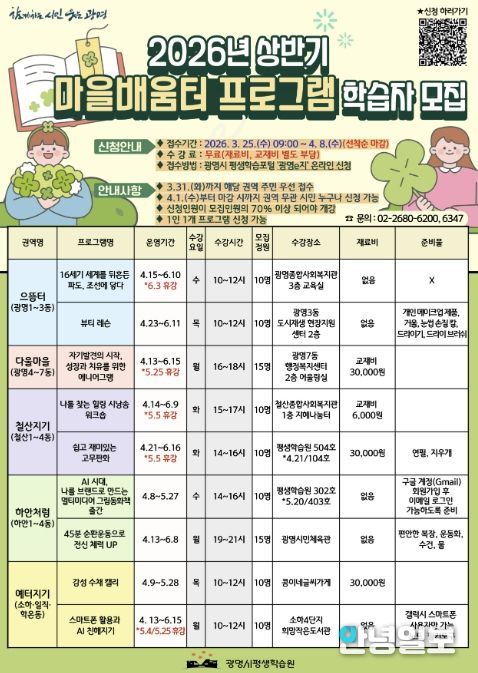 안녕일보 배윤 기자 | 광명시가 시민들이 생활권 내에서 평생학습을 누릴 수 있도록 ‘2026년 상반기 권역별 마을배움터 프로그램’ 수강생을 오는 4월 8일까지 모집한다.