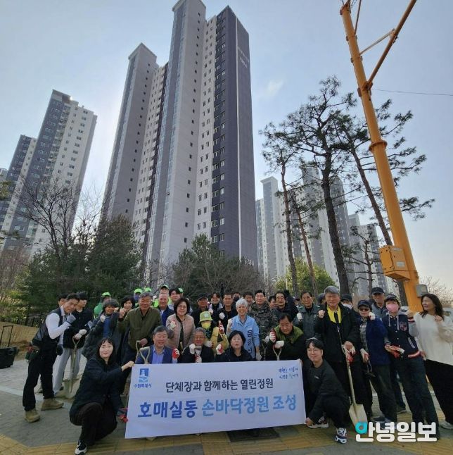 안녕일보 배윤 기자 | 지난 24일, 수원시 권선구 호매실동은 쾌적한 마을 환경 조성과 도심 속 정원 문화 확산을 위해 아파트 단지 인근 유휴지에 ‘손바닥 정원’을 조성했다.