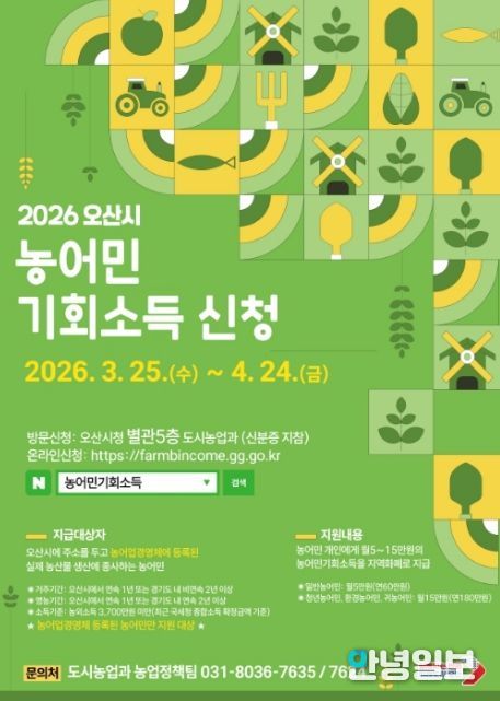 안녕일보 배윤 기자 | 오산시는 농업·농촌의 공익적 가치 보장과 농어촌 소멸위기 대응을 위해 ‘2026년 농어민 기회소득’ 신청·접수를 3월 25일부터 4월 24일까지 진행한다고 밝혔다.