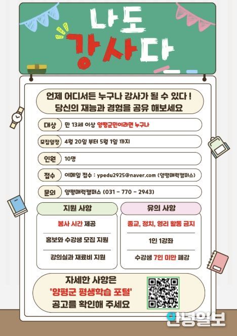 전진선 양평군수는 “이번 사업은 누구나 가르치고 배우는 즐거움을 지역사회에 확산하기 위해 마련됐다”며 “자신의 재능이 작아 보일지라도 누군가에게는 소중한 배움이 될 수 있는 만큼, 평소 강사를 꿈꿨던 군민들의 적극적인 참여를 바란다”고 전했다.
