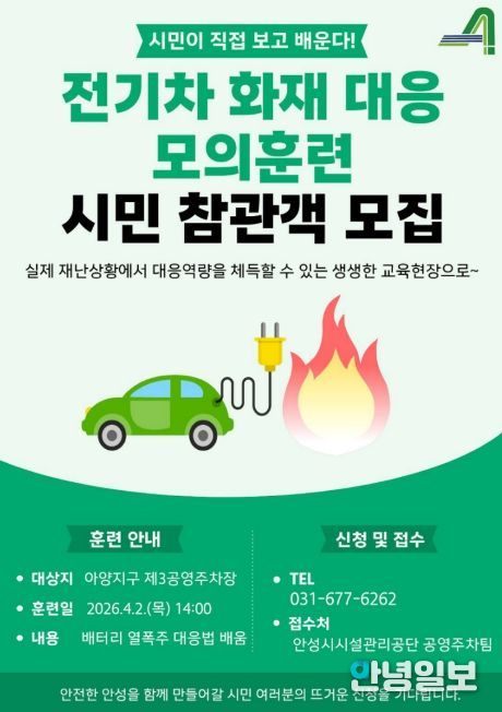 안녕일보 배윤 기자 | 안성시시설관리공단은 오는 4월 2일 목요일 오후2시 안성시 옥산동 소재 아양지구 제3공영주차장에서 ‘시민과 함께하는 2026년 재난대응 모의훈련’을 실시한다고 밝혔다.