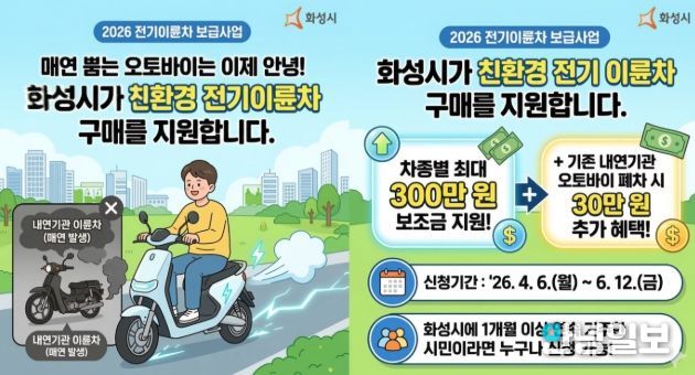 안녕일보 배윤 기자 | 화성특례시가 온실가스 감축과 대기환경 개선을 위해 2026년도 상반기 전기 이륜차 보급 사업 신청자 모집을 한다고 25일 밝혔다.