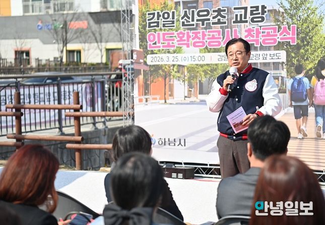 하남시는 25일 오후 3시 감일동 신우초등학교 교량 인근 보도에서 ‘신우초등학교 교량 인도확장 공사 착공식’을 개최했다. 이날 행사에는 이현재 하남시장을 비롯한 주요 내빈들이 참석해 공사 계획 보고를 청취한 뒤 성공적인 공사를 기원하는 첫 삽 퍼포먼스와 기념촬영을 진행했다.