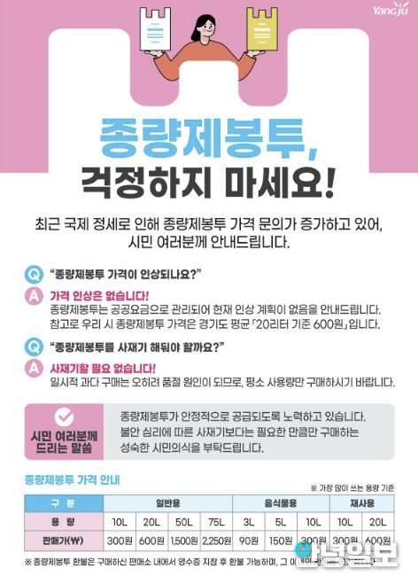 안녕일보 배윤 기자 | 양주시가 최근 유가 상승 등 중동 정세 불안과 관련해 종량제봉투 수급에 대한 시민들의 우려가 제기됨에 따라, 종량제봉투 공급상황과 가격정책에 대한 공식 입장을 밝혔다.