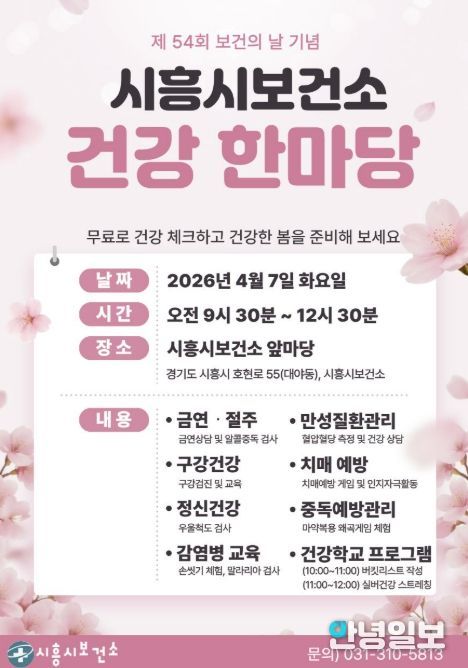 안녕일보 배윤 기자 | 시흥시가 오는 4월 7일 ‘제54회 보건의 날’을 맞아 시흥시보건소 앞마당에서 시민의 질병 예방과 건강 인식 제고를 위한 ‘건강 한마당 홍보관’을 운영한다.