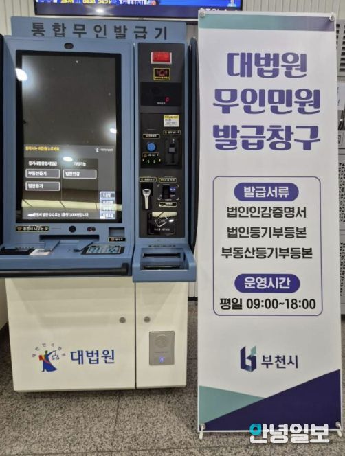 안녕일보 배윤 기자 | 부천시는 3월 27일부터 시청 민원실에 대법원 통합무인발급기를 설치하고 운영을 시작한다.