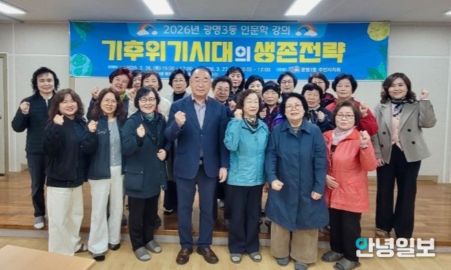 안녕일보 배윤 기자 | 광명시 광명3동 주민자치회(회장 민병돈)는 기후위기 시대에 대응하는 시민 의식을 확산하기 위해 지난 26일부터 27일까지 이틀간 ‘기후위기 시대의 생존전략’ 인문학 특강을 개최했다.