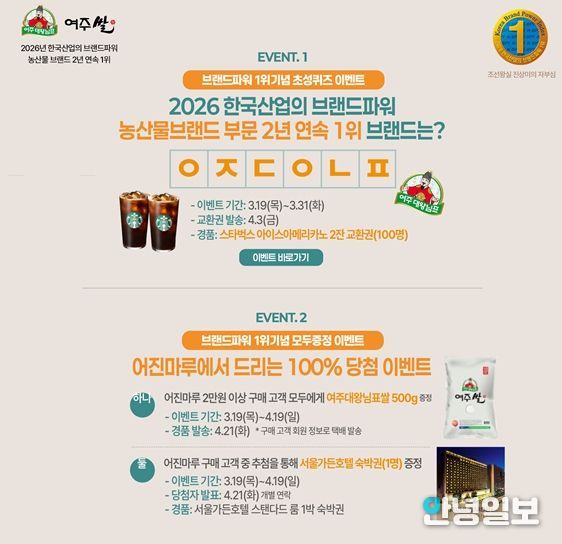 먼저, 어진마루몰 초성퀴즈 이벤트는 ‘2026 한국산업의 브랜드파워 농산물 브랜드 부문 2년 연속 1위 브랜드는?’이라는 질문에 대한 정답을 맞히는 방식으로 진행된다. 이벤트 기간은 3월 19일부터 3월 31일까지이며, 참여자 중 추첨을 통해 스타벅스 아이스 아메리카노 2잔 교환권(100명) 이 제공된다. 교환권은 4월 3일 일괄 발송될 예정이다.