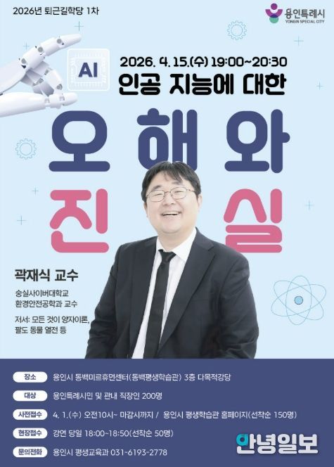 안녕일보 배윤 기자 | 용인특례시는 4월 15일 오후 7시부터 동백미르휴먼센터 3층 동백평생학습관 다목적 강당에서 ‘2026년 퇴근길 학당’ 첫 번째 강연을 한다고 31일 밝혔다.