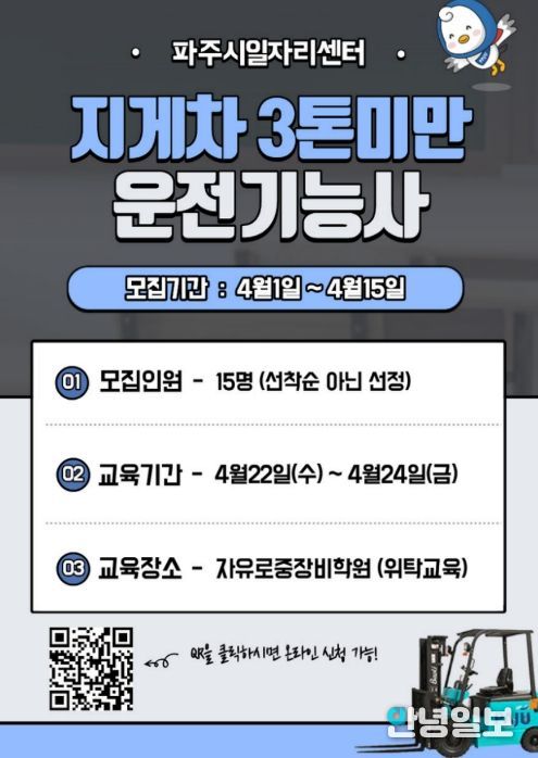 안녕일보 배윤 기자 | 파주시는 4월 1일부터 4월 15일까지 관내에 거주하는 중장년층 구직자를 대상으로 ‘지게차(3톤 미만) 운전기능사’취업지원 프로그램 참여자 15명을 모집한다고 밝혔다.
