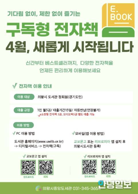 안녕일보 배윤 기자 | 의왕시가 4월부터 시민의 정보 접근성을 높이고 디지털 독서문화 확산을 위해 ‘구독형 전자책 서비스’와 ‘온라인 학술 데이터베이스(DBpia) 서비스’를 도입한다.