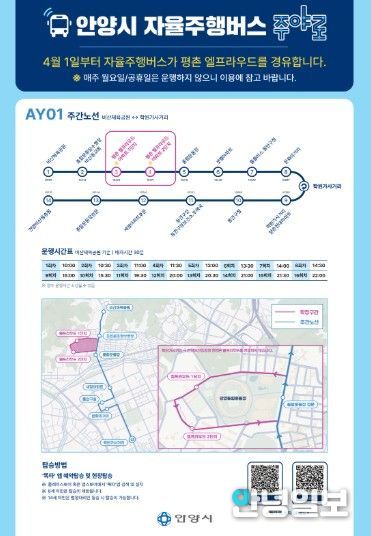 현재 무상으로 운영되는 '주야로'는 경기도 통합교통플랫폼 '똑타' 앱으로 사전 예약하거나, 정류장에서 별도의 예약 없이 바로 탑승할 수 있다. 포털 사이트 지도나 버스 정보 앱에서 노선 번호 'AY01'을 검색하면 실시간 버스 위치도 확인 가능하다.