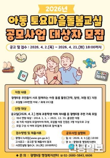 안녕일보 배윤 기자 | 광명시 광명6동 행정복지센터는 오는 21일까지 ‘2026년 아동 토요마을돌봄교실 공모사업’에 참여할 주민 가족 모임 20개 팀을 모집한다.