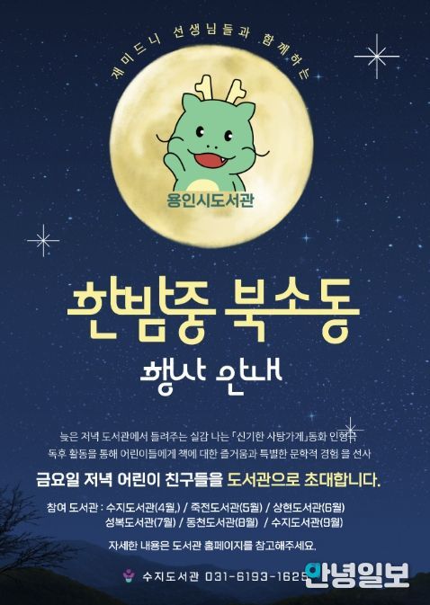 안녕일보 배윤 기자 | 용인특례시 서부도서관은 수지‧죽전‧상현‧성복‧동천도서관에서 야간 독서문화 프로그램 ‘한밤중 북소동’을 운영한다고 25일 밝혔다.