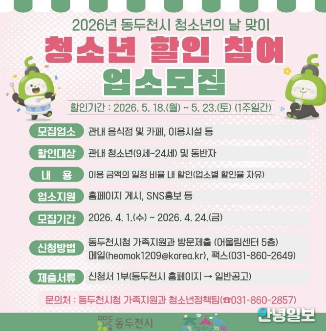 안녕일보 배윤 기자 | 동두천시는 오는 5월 청소년의 날을 맞이하여 청소년 복지를 증진하고 지역경제를 활성화하기 위해 오는 5월 18일부터 5월 23일까지 6일간 ‘청소년 할인 주간’을 운영한다.