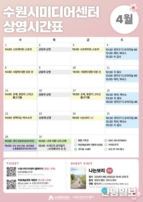 수원시미디어센터 관계자는 “이번 업무협약을 통해 누구나 차별 없이 문화를 접하고 누릴 수 있는 환경을 조성하고자 한다”며, “4월 장애인의 날을 맞아 운영하는 기념 프로그램을 시작으로, 배리어프리 영화 상영을 지속 확대해 나가겠다”고 밝혔다.