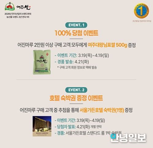 이번 이벤트는 ‘대왕님표 여주쌀’의 한국산업의 브랜드파워(K-BPI) 농산업 부문 1위 2년 연속 선정 성과를 기념해 마련됐다. 한편, 지난 3월 19일부터 3월 31일까지 진행된 ‘여주대왕님표’ 초성퀴즈 이벤트에는 총 7,883명이 참여하며 높은 관심 속에 성황리에 마무리됐다.