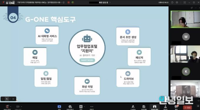 이번 교육은 경기도교육청에서 교직원의 업무경감을 위하여 야심 차게 추진 중인 업무협업포털 ‘지원이(G-ONE)’의 현장 안착을 지원하고, 디지털 기술을 활용한 행정 업무의 효율성을 높이기 위해 마련됐다. 아울러, 교육은 ‘지원이(G-ONE)’플랫폼 내 화상회의 기능인 ‘지원이(G-ONE) 미팅’을 통한 실시간 온라인 방식으로 진행됨에 따라 ‘지원이(G-ONE)’의 기능을 보다 현실감 있게 전달하는 계기가 됐다.