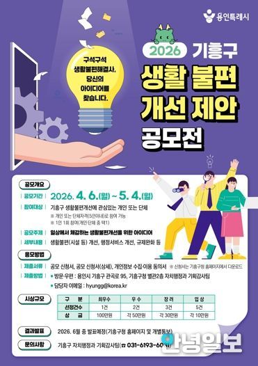 안녕일보 배윤 기자 | 용인특례시 기흥구는 오는 6일부터 5월 4일까지 ‘2026 기흥구 생활불편개선 제안 공모전’을 개최한다.
