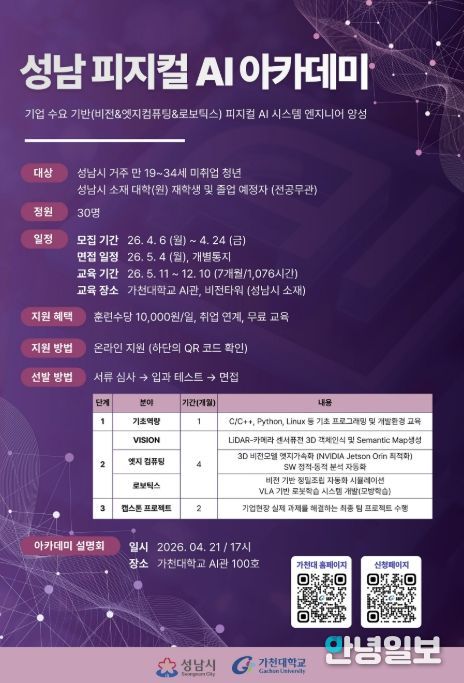 안녕일보 배윤 기자 | 성남시는 물리 세계와 인공지능(AI)을 결합한 ‘피지컬 인공지능(AI)(Physical AI)’ 분야 핵심 인재를 양성하기 위해 ‘성남 피지컬 인공지능(AI) 아카데미’ 교육생을 4월 24일까지 모집한다.