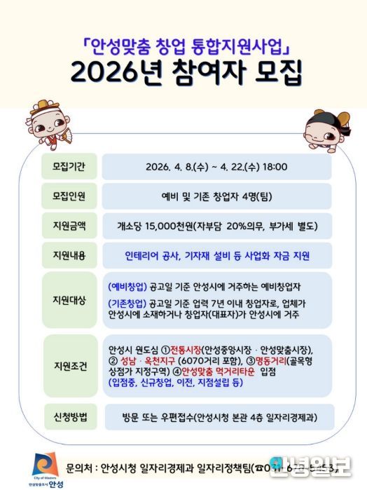 안녕일보 배윤 기자 | 안성시는 오는 4월 8일 수요일부터 22일 수요일까지 ‘2026년 안성맞춤 창업 통합지원사업’ 참여자를 모집한다. 이번 사업은 전통시장과 골목상권에 창업을 유도함으로써 지역 상권을 활성화하고, 이를 차세대 문화·관광 자원으로 발전시키기 위해 기획됐다.