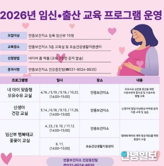 안녕일보 배윤 기자 | 평택시 안중보건지소는 관내 임산부들의 건강한 출산을 돕고 체계적인 육아 정보를 제공하기 위해 ‘2026년 임신․출산 교육 프로그램’을 본격 운영한다고 밝혔다.